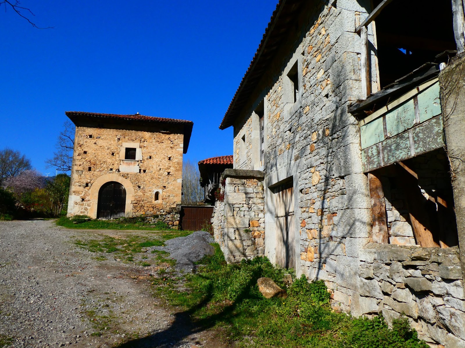Pero el edificio principal es este al que nos acercamos ahora, del que vemos solamente el antiguo pajar ahora integrado en el hostel. La panera tapa la fachada de la vivienda pero enseguida vamos a verla. Según nos acercamos compartimos la descripción que hallamos en la página web de esta antigua casería que es ahora parada y fonda de visitantes y peregrinos: