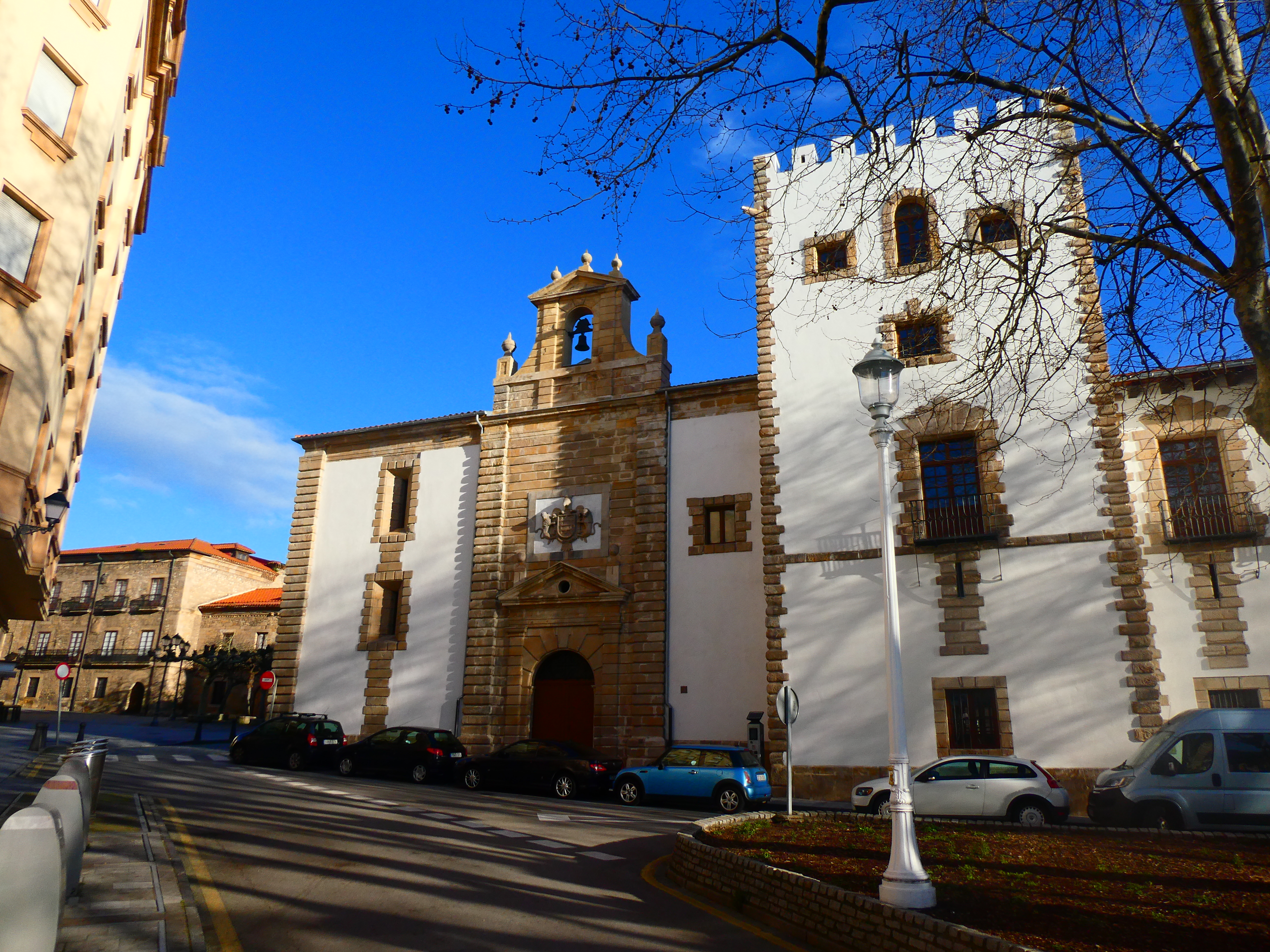 Procedentes de La Guía y El Molinón, los peregrinos han recorrido el Paseo del Muro de Gijón/Xixón, ante la Playa San Lorenzo y, siguiendo la calle Cabrales por este hermoso paseo marítimo, entran en el barrio alto o antiguo de Cimavilla, llegando a la antigua Pescadería Municipal, que vemos aquí a la izquierda de la foto ,al lado de La Rampla o La Rampla la Pescadería, la Escalera 2 de acceso a la playa. La pescadería es en la actualidad un edificio de oficinas municipales tras su remodelación en 1996, pues la casa consistorial, que vemos por su parte posterior, está justo a continuación. Hacia a ella, a la izquierda, sigue el Camino de Santiago, pasando a la Plaza Mayor, pero nosotros en esta entrada de blog vamos a acercarnos a la iglesia de San Pedro, recorriendo las arboledas del Campo Valdés, con el palacio de este nombre, el Palacio Valdés, justo detrás (se ven sus torres y su capilla de Guadalupe, esta a la izquierda, mirando al Ayuntamiento)