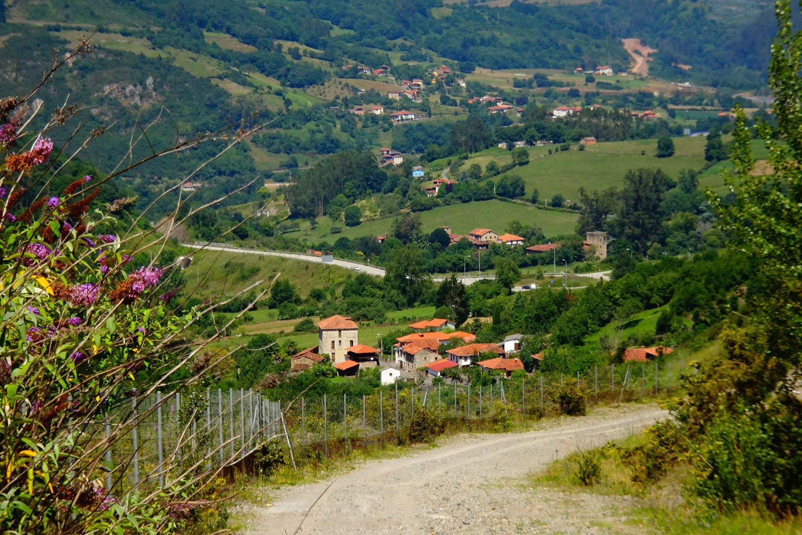 Prados abajo a la izquierda, más allá del matorral, las casas de La Reaz nos sirven también de referencia para saber hacia donde nos encaminamos en la ruta por esta parroquia de Doriga