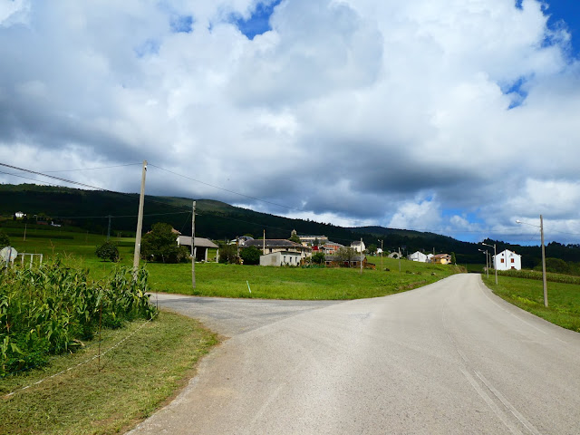 Esta a carretera dibuja aquí una larga recta hasta la iglesia. No suele haber mucho tráfico pero este sí es muy veloz en este tramo, extrememos pues la precaución