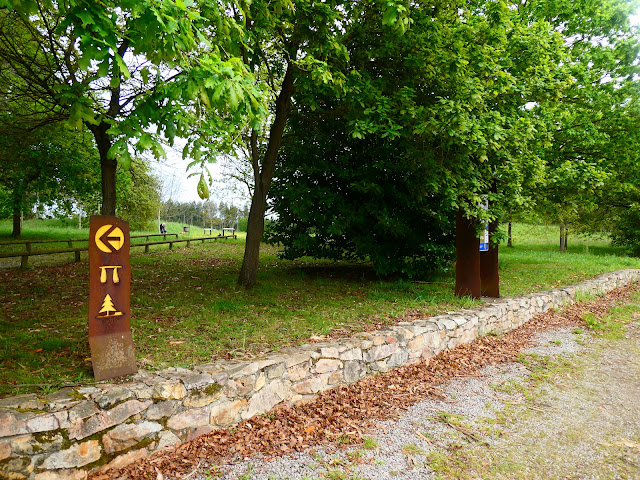 Un poco más adelante, la cancela o portilla de entrada; aquí damos vista a una las largas rectas del Camino en la meseta del Monte Areo, que puede decirse no tiene una cima-promontorio especialmente prominente sino que es una gran planicie que se extiende en dirección nordeste-suroeste, que es el trayecto que estamos siguiendo nosotros