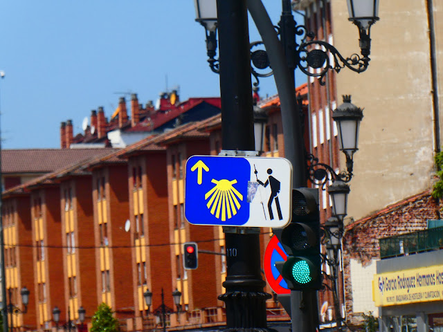 Las bases de las farolas son muy óptimas para pintar las pertinentes flechas amarillas que orientan al peregrino hacia la omnipresente catedral, que domina la calle desde lo alto. No podemos dejar de pensar en el personaje de Fermín de Pas, El Magistral de Vetusta, personaje de la novela La Regenta de Leopoldo Alas Clarín, que oteaba la ciudad, a la que Clarín llama novelescamente Vetusta, desde la torre con su catalejo: