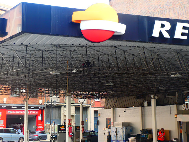 La abundancia de servicios, supermercados, tiendas, comercios, hostelería, y unas buenas aceras, pueden compensar el paso por un trayecto urbano que no suele ser el favorito de los peregrinos, más dados por lo general a entornos naturales y rurales o, en caso de ser urbano, los siempre apetecibles cascos históricos. En el caso del ovetense pronto llegaremos a él pero, si nos cansamos, anda que no habrá sitios donde parar, como esta terraza en la explanada de la derecha, a continuación del super, la del Bar 3/4