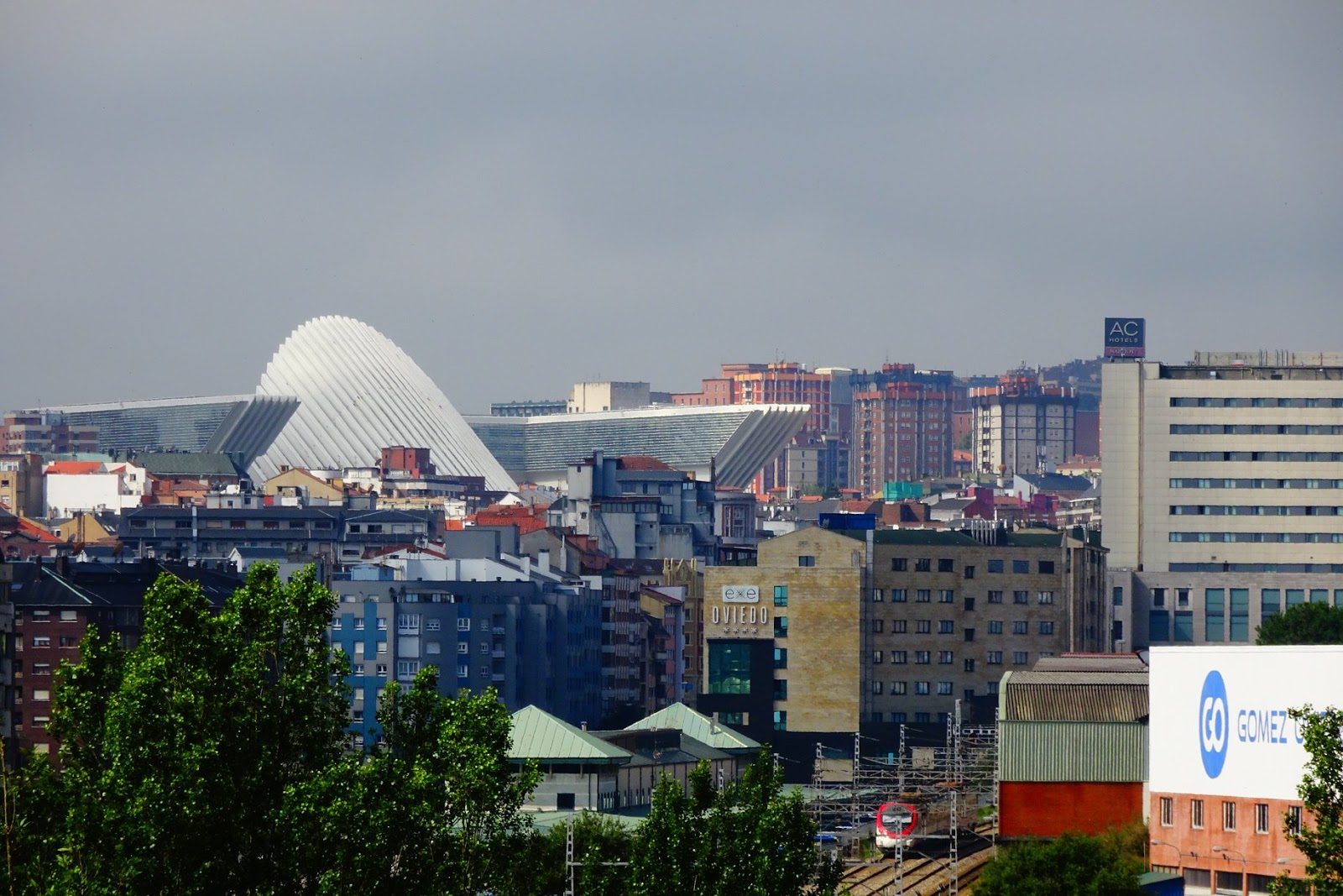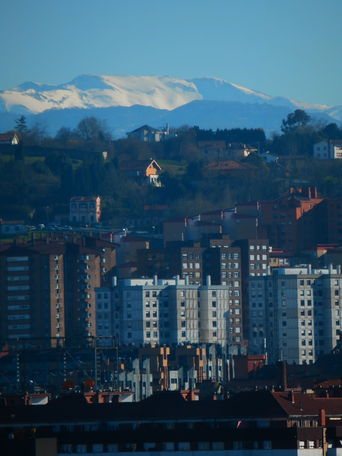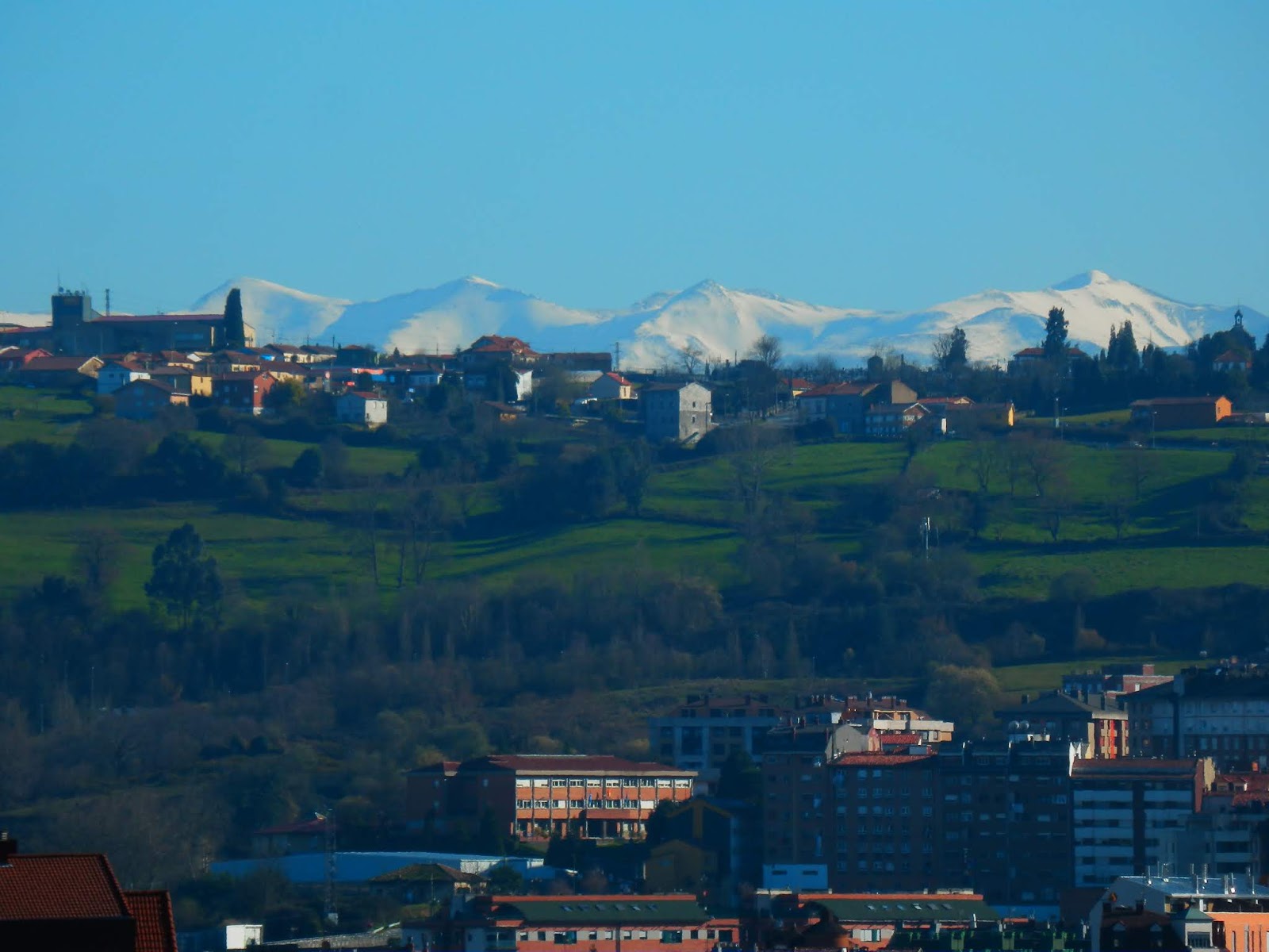 Los rascacielos del ensanche, la ciudad que creció desde su núcleo medieval hacia la Estación del Norte, miran al Monsacro o La Madalena, totémico monte donde se asegura se custodiaron las reliquias de Jerusalén que, huyendo durante años de invasiones, acabaron allí, guardadas por eremitas, hasta que Alfonso II las trajo a esta su capital a partir del año 791 en el que llegó, por segunda vez y tras no pocos avatares, al trono. Más lejos aún y nevado tenemos el Aramo, la gran montaña central asturiana, con los 1791 metros de altitud del Gamoniteiru como cota más alta, fácil de reconocer por su antena