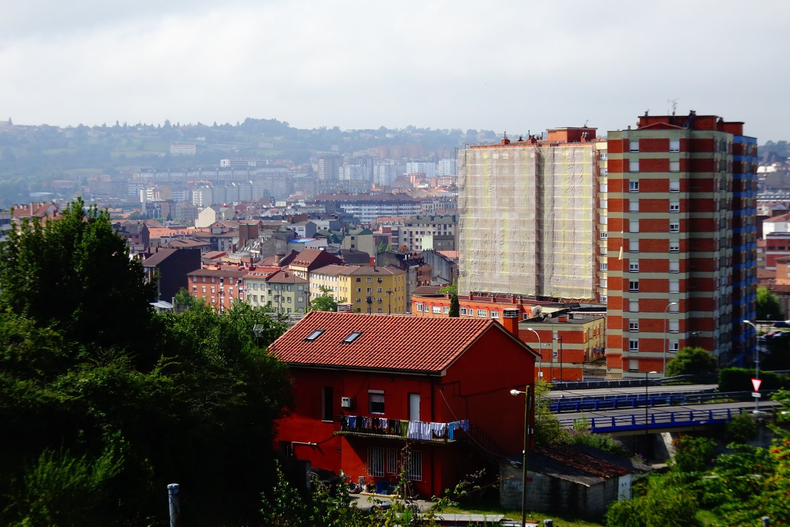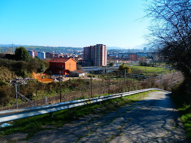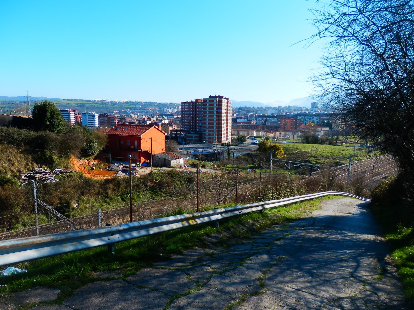 Pero mirando al otro lado y volviendo la vista atrás empezaremos a tener buenas perspectivas de la ciudad, que se ampliarán según sigamos subiendo. Aquí tenemos, en primer término y al otro lado de las vías, Les Cases del Túnel, Las Torres de Pando y Pumarín