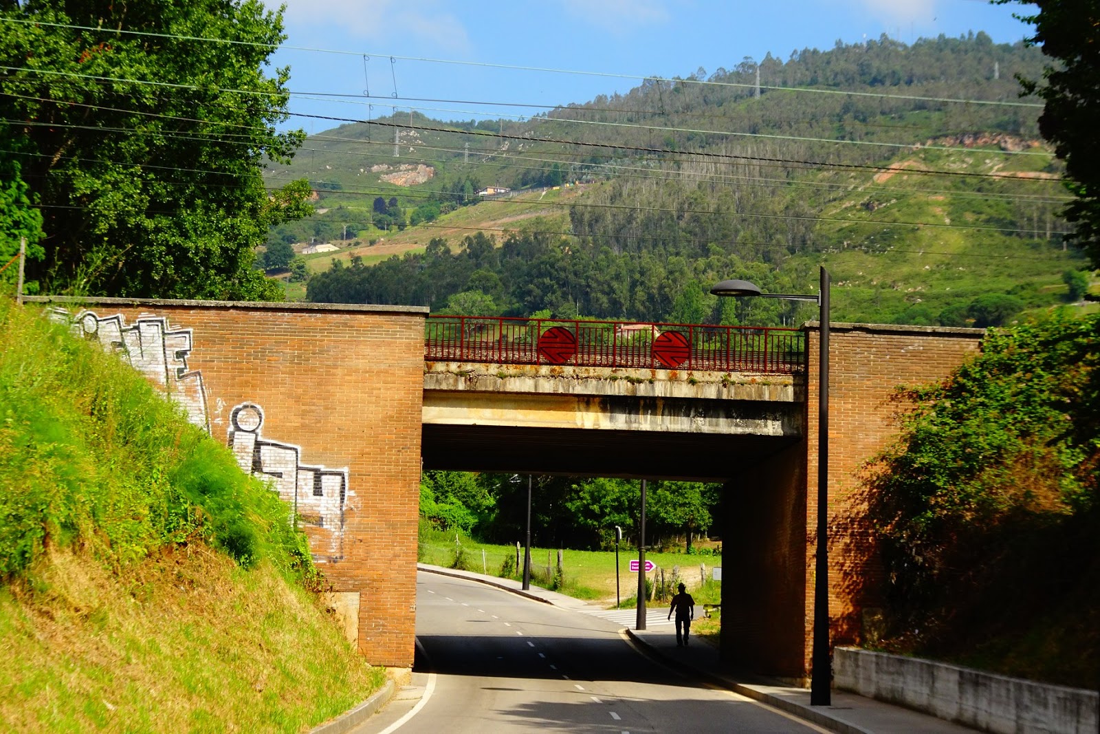 Vemos un paso de peatones, el GR 100.1 cruza allí y sigue bosque abajo a cruzar el Nora por El Puente Vieyu en dirección a Lucus Asturum, para luego continuar a Gijón/Xixón, una ruta que es fácil hubiesen seguido también antiguamente peregrinos dada su gran antigüedad. Nosotros, ya lo hemos dicho y lo recalcamos, seguiremos a la izquierda