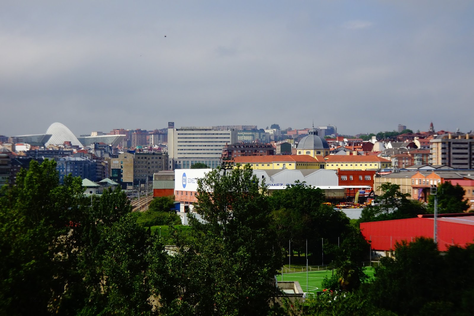 Más a lo lejos, Buenavista, otra antigua aldea ovetense, así llamada por estar en lo alto de una loma desde la que se domina una gran panorámica del gran valle central asturiano, siendo urbanizada toda la zona tras la Guerra Civil como zona de expansión de la ciudad al oeste. Ya antes de la contienda se construyó en 1932 el estadio Carlos Tartiere, del Real Oviedo, clausurado y trasladado en 2000, en su lugar se construyó el Palacio de Congresos, del que vemos su grande (y polémica) cúpula, conocido como El Calatrava por ser proyecto del arquitecto Santiago Calatrava