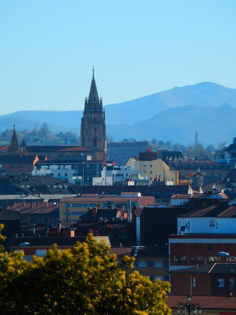 Reconocemos perfectamente bien la solitaria torre gótica de la catedral del Salvador o San Salvador, con su hermana pequeña debajo, la del convento de San Pelayo, cuyos orígenes están en el de San Juan de los tiempos en los que la naciente ciudad era escogida como sede regia por Alfonso II El Casto, bajo cuya égida dicen crónicas posteriores se descubrió el que se tiene por sepulcro de Santiago en Compostela, al otro extremo de sus dominios. Incluso dichas crónicas afirman que el mismo rey acudió en persona desde allí, sus palacios y naciente basílica prerrománica del Salvador, antecesora de la catedral, a verificar dicho descubrimiento, lo que haría de él el primer peregrino de nombre conocido. Más a lo lejos, el Picu Castiellu (449 m) de Tudela guardaba el paso por el Alto del Padrún del camino que comunica con León, el Camino del Salvador, por el que venían muchos peregrinos desde la meseta. Más en la distancia, El Picu Gúa (658 m), divisoria con el concejo de Mieres
