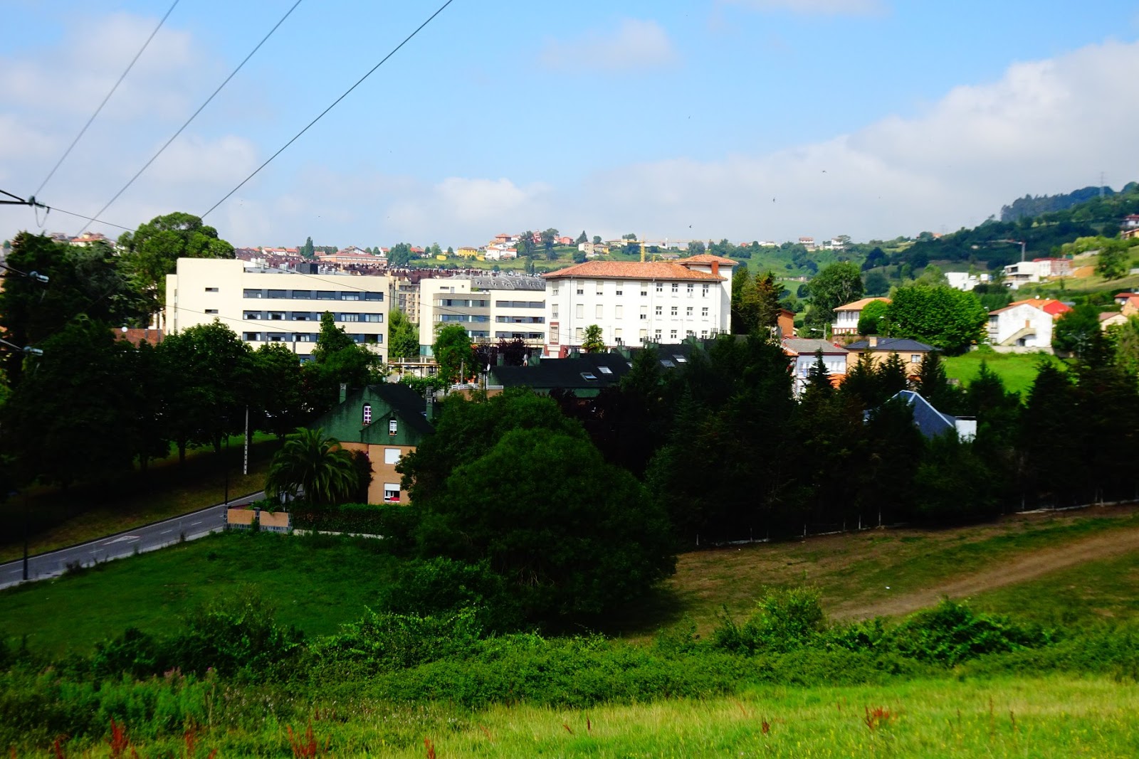 Por allí al oeste estaría aquel plano inclinado hacia la Estación del Norte, pero aquí abajo y más cerca tenemos los edificios de la Fundación Docente de Mineros Asturianos (FUNDOMA), institución fundada en diciembre de 1929 como centro de asilo y educación para niños huérfanos de la minería, orfanato minero. Evolucionó a lo largo del tiempo y, con la desaparición de su principal fuente de ingresos, la cuota del carbón, y la nacionalización de las minas con HUNOSA, esta se hizo cargo de sus funciones. En 1991 pasó a ser conocida con su denominación actual