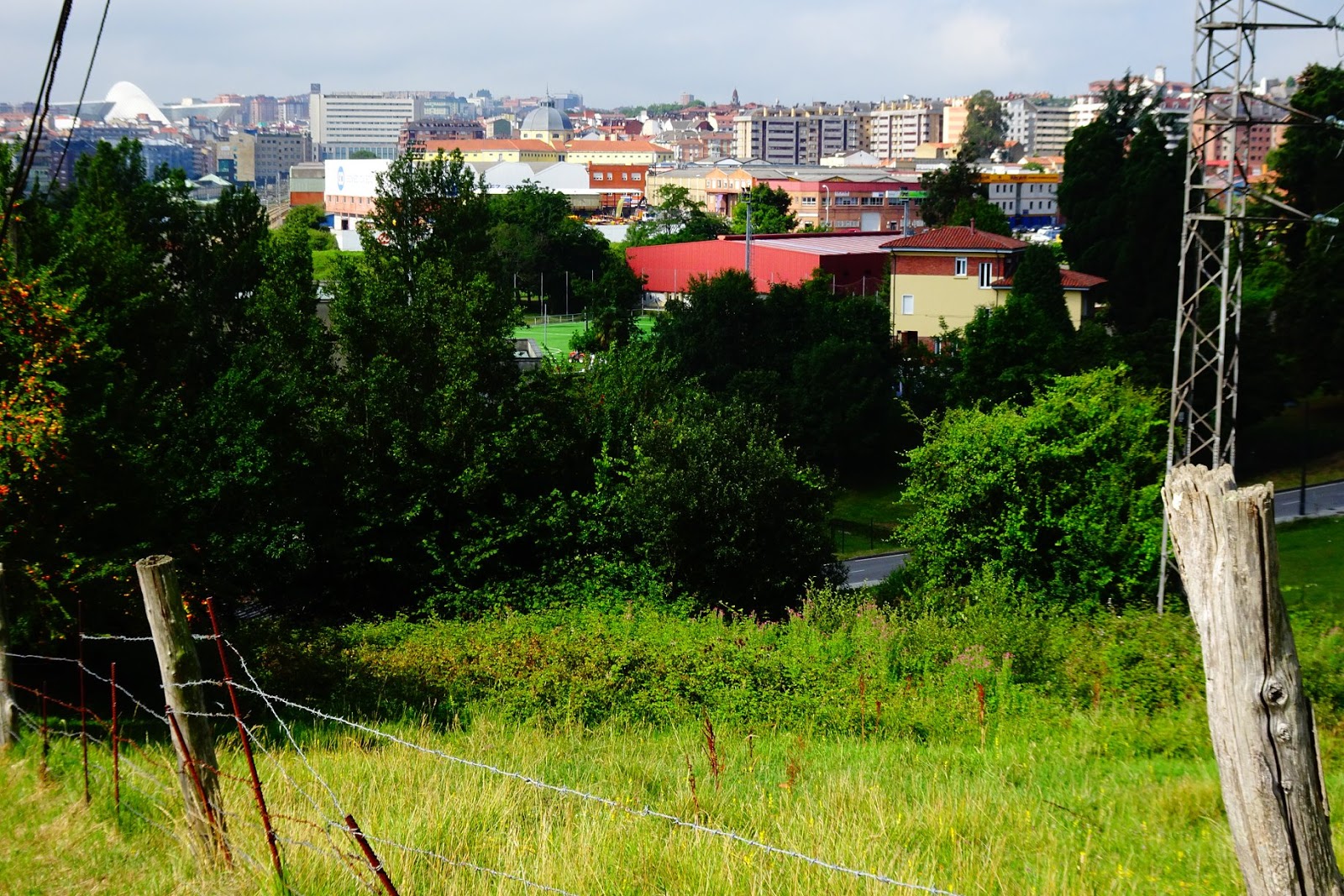 Abajo vemos el ferrocarril y, a su izquierda, la Estación de Autobuses, inaugurada en 2003 donde estaba la estación ferroviaria de FEVE. La cercanía de la Estación del Norte favoreció la edificación de la zona. Algo más allá estaba el Acueducto de los Pilares, que antaño llevaba el agua de los manantiales del Naranco a la ciudad, cerca del paso del Camino Primitivo, que por la calle Independencia se dirige a L'Argañosa