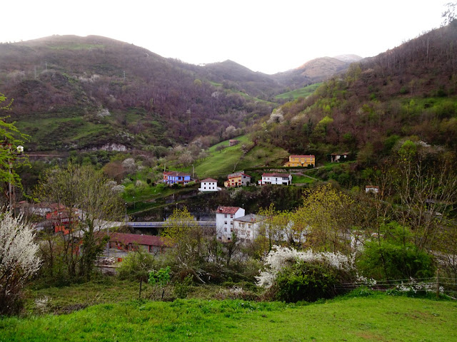 A lo lejos, abajo el valle, en las cercanías de Campumanes, se unen los ríos Payares y Güerna para formar el río Lena/L.lena. Arriba en la distancia volvemos a ver el Aramo