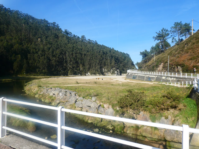 Y ya estamos en el borde de la orilla del Ríu Cabra, que forma un poco de meandro al llegar a la playa, cuyo arenal ya empezamos a ver desde aquí, más allá del comienzo de las barandillas del paseo marítimo