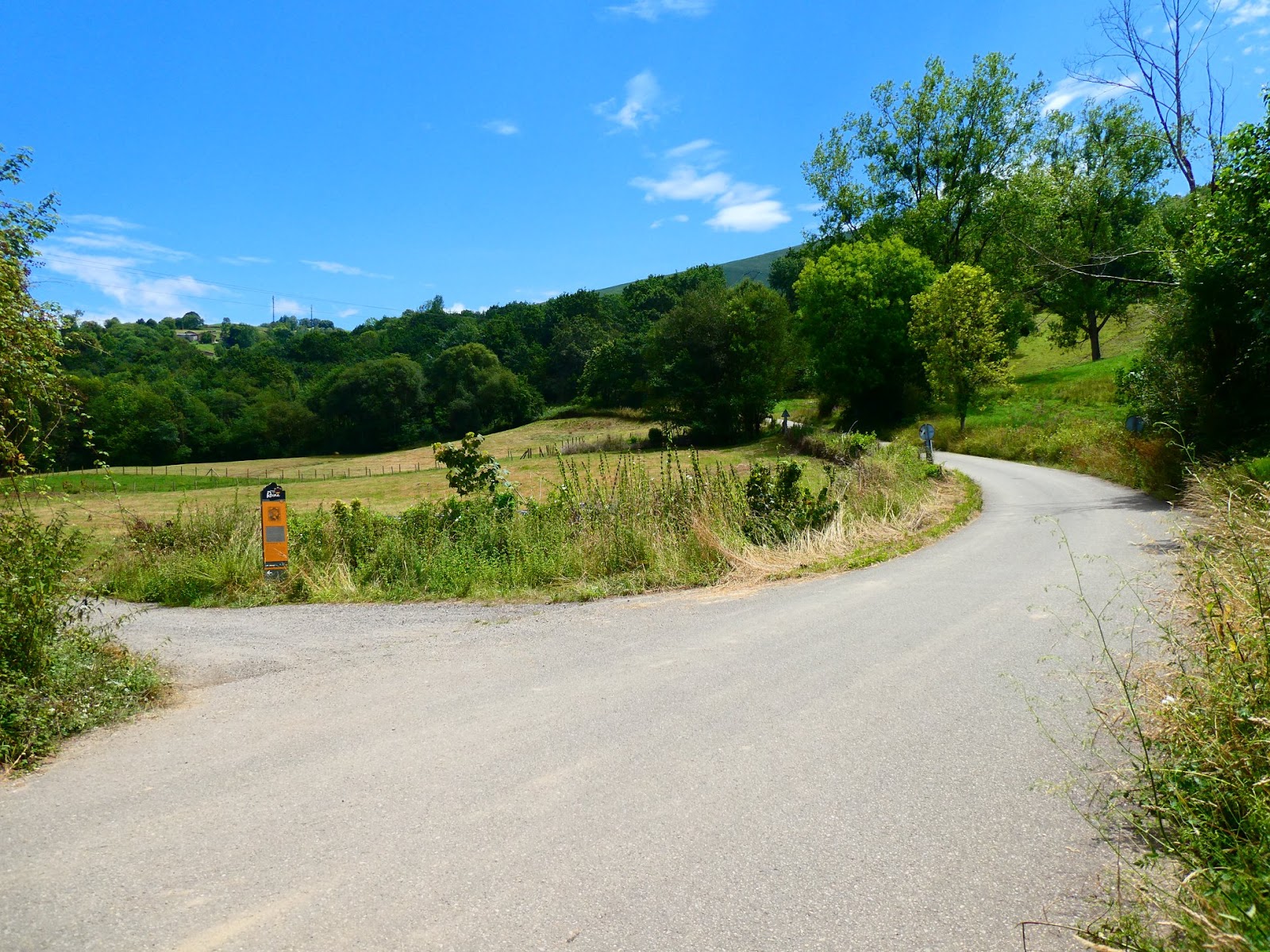 Entre praos y castañeos, la carretera local de Sorribes, por el mismo canto de la colina, sigue rampa arriba
