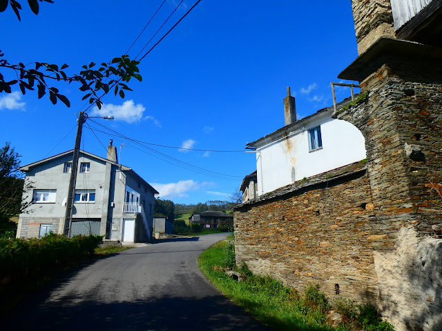 En plena subida, en una explanada habilitada en la ladera del monte, donde hay una gran nave, la del Centro Cultural San Xusto de Cabarcos, el centro social de la parroquia, donde se celebran las fiestas y diversas actividades, y aquí abajo, es el barrio de O Corveiro, donde empieza la gran cuesta, justo pasada A Curva, el bar del lugar, vinculado a la fábrica de cerveza artesana Augas Santas, una de las novedosas iniciativas que surgen en los pueblos de este histórico valle, al paso del Camino