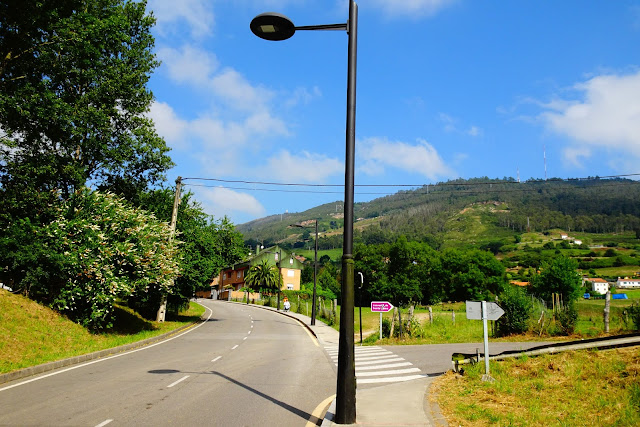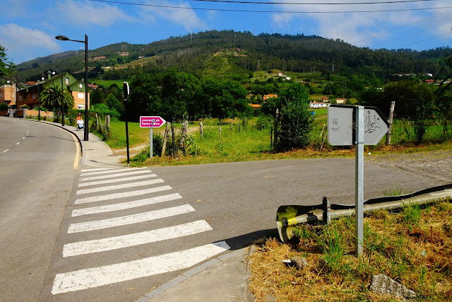 Vemos un paso de peatones, el GR 100.1 cruza allí y sigue bosque abajo a cruzar el Nora por El Puente Vieyu en dirección a Lucus Asturum, para luego continuar a Gijón/Xixón, una ruta que es fácil hubiesen seguido también antiguamente peregrinos dada su gran antigüedad. Nosotros, ya lo hemos dicho y lo recalcamos, seguiremos a la izquierda