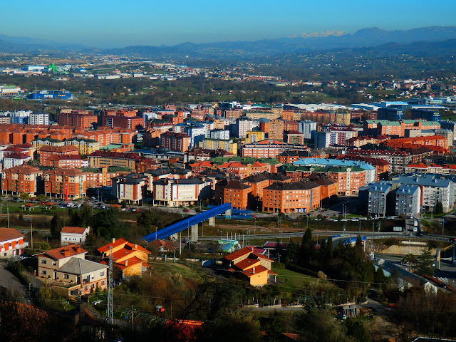 Pero mirando al otro lado y volviendo la vista atrás empezaremos a tener buenas perspectivas de la ciudad, que se ampliarán según sigamos subiendo. Aquí tenemos, en primer término y al otro lado de las vías, Les Cases del Túnel, Las Torres de Pando y Pumarín