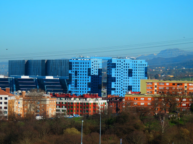 Más a lo lejos, Buenavista, otra antigua aldea ovetense, así llamada por estar en lo alto de una loma desde la que se domina una gran panorámica del gran valle central asturiano, siendo urbanizada toda la zona tras la Guerra Civil como zona de expansión de la ciudad al oeste. Ya antes de la contienda se construyó en 1932 el estadio Carlos Tartiere, del Real Oviedo, clausurado y trasladado en 2000, en su lugar se construyó el Palacio de Congresos, del que vemos su grande (y polémica) cúpula, conocido como El Calatrava por ser proyecto del arquitecto Santiago Calatrava