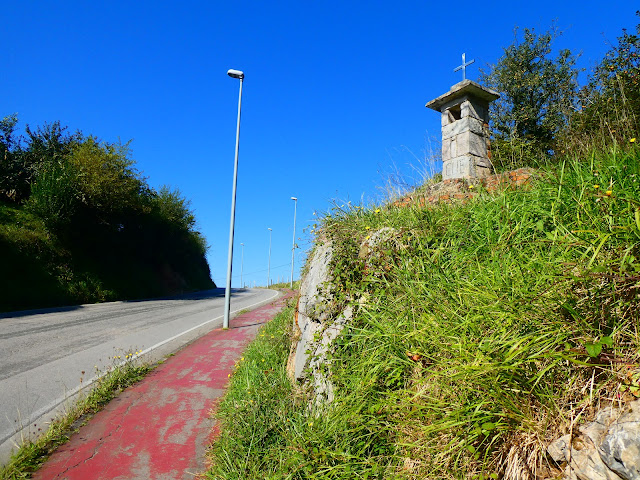 Arriba, cerca de la cima de El Cantu H.ariu o Jariu, que con sus 188 metros es la mayor altura de La Cuesta Cue, discurre la senda costera, que enlazará con el Camino de Santiago en la ermita del Cristo del Camino, algo más al oeste, nosotros en esta ruta lo haremos en el centro de Llanes, cerca del puente sobre El Ríu Carrocéu