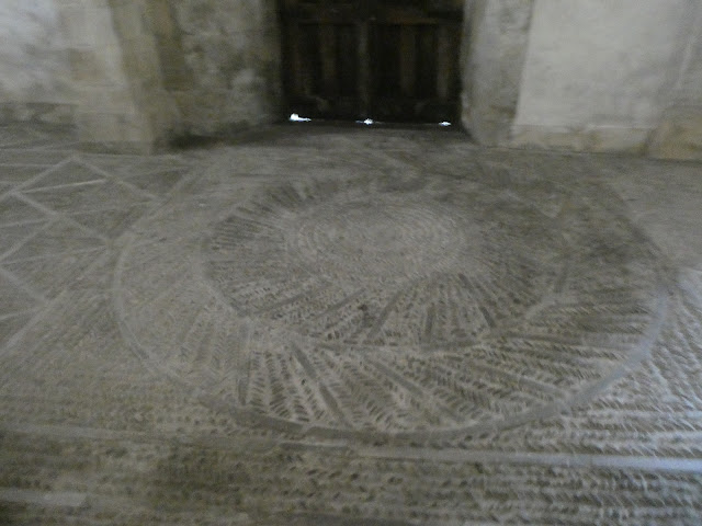 Volvemos a contemplar los grandes círculos del suelo y, a la izquierda, en el muro románico, un sepulcro de arco de medio punto con arcosolio