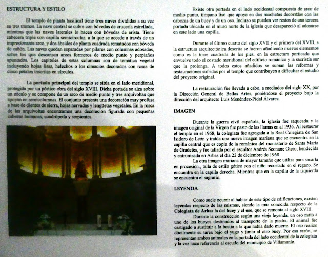"Al franquear la puerta de acceso a la iglesia hay dos modillones en piedra representando a un oso y un buey, el oso y el buey de de la leyenda. Tal eco social ha adquirido la leyenda que está incorporada al escudo del municipio.Los canónigos agustinianos acarreaban la piedra rosada desde el pico de los Tres Concejos por el camino de Pendilla a Arbas y por el camino de Nuestra Señora de Tonín a Arbas para construir el hospital. Empleaban la carreta celta, cantora, de eje unido a las ruedas y untado con tocino y con salgueira para que el carro cantara. Los carros cantores se oían por los valle como un encanto del paisaje. Ni el más sofisticado automóvil moderno lleva incorporada una música tan subyugadora y celestial como los carros centella .Al yugo, uncidos tiraban del carro centella la pareja de bueyes. El oso, -temible oso totémico de los peregrinos, mató a uno de los bueyes y el canónigo Pedro lo castigó a ser uncido con el otro buey para acarrear la piedra con la que fue construido el hospital."