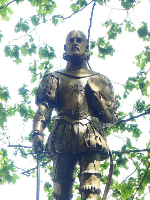 Por aquello el marino (a quien le resultó imposible leer la coña de Quevedo de que «más vale ser adelantado de un cachete que de Castilla» y con la que creo que nunca hubiera estado de acuerdo) luce, aquí y allí, en piedra y en bronce, el título de Adelantado de La Florida.