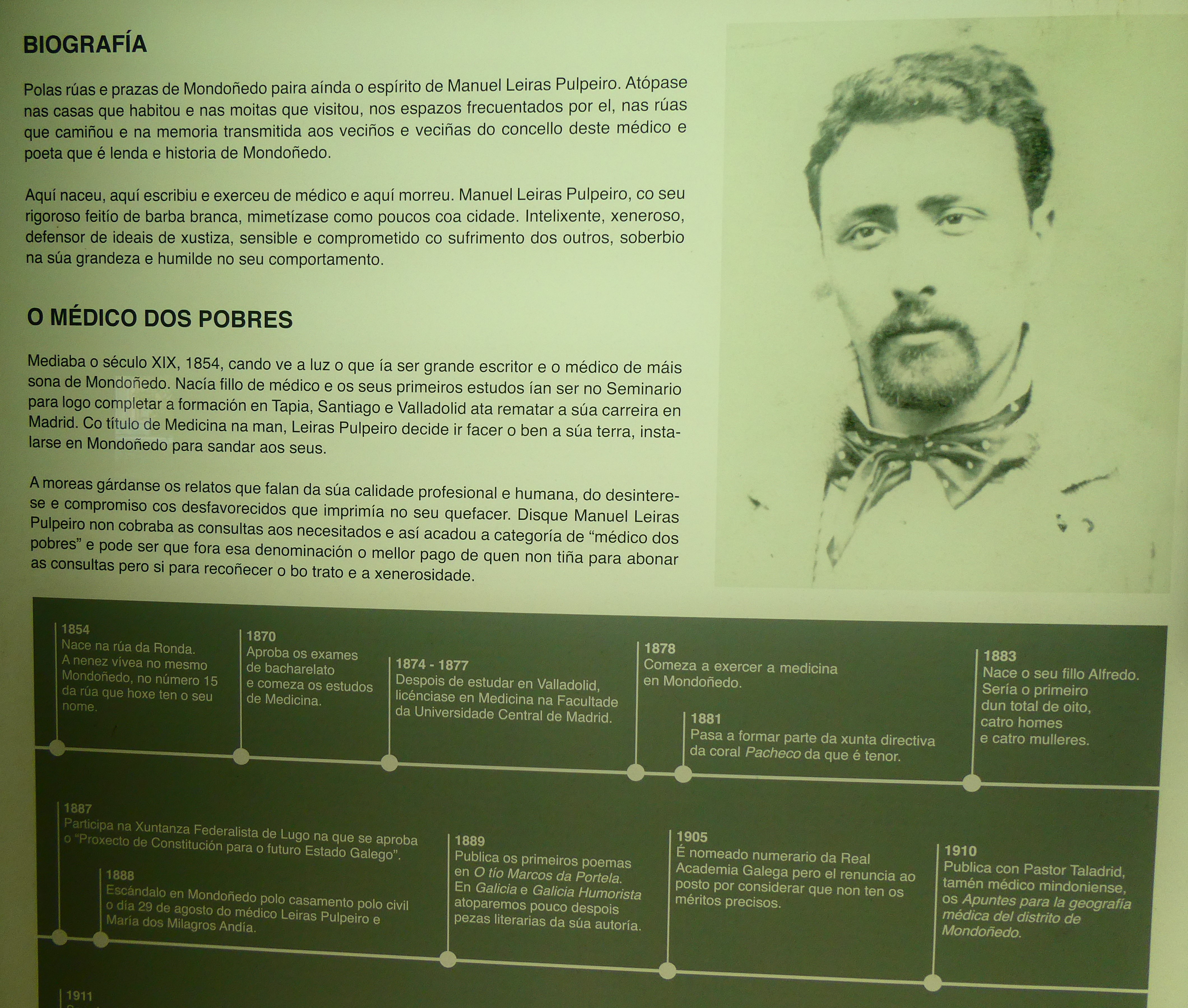 "En Mondoñedo, patria de aquel extraordinario fabulador llamado Álvaro Cunqueiro, nació, en 1854, Manuel Leiras Pulpeiro, el poeta que este año protagoniza nuestra gran fiesta literaria: el Día das Letras Galegas. Pese a que falleció hace más de 70 años (1912), las gentes de Mondoñedo y su comarca aún mencionan su nombre con emoción, y la cita contiene, todavía, parte del respeto que infundía en su tiempo aquel santo laico que ejerció la medicina, en barrios y aldeas, con vocación, compromiso y generosidad.La novela ejemplar de su vida vive aún en la memoria de las gentes. Muchos ni siquiera saben que escribió versos, pero todos saben que fue un ser humano cabal y un médico abnegado. En su mausoleo, erigido en 1921 con el difícil dinero de los emigrantes de su pueblo, está grabada esta lacónica inscripción: "Amou a verdade e practicou o ben" ("Amó la verdad y practicó el bien"). Nadie, que se sepa, ha visto retórica o hipérbole en este hermoso epitafio.