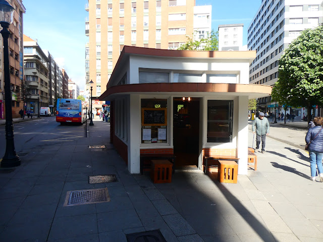 Frente a nosotros, en la esquina, el 11.11 Art Café. La ciudad, incluyendo los barrios residenciales, centro, obreros-fabriles y otros está en nuestros días casi plenamente dedicada al sector comercial, servicios y hostelería. Las industrias y factorías de antaño o bien han desaparecido o se han transformado; tanto estas como las nuevas suelen estar ahora en los polígonos industriales del extrarradio, al su de la ciudad, Roces-Porceyo y Tremañes-Veriña principalmente