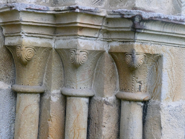 Volviendo a los ábsides, si bien cierto es que las ventanas son lisas y sencillas, muchos canecillos que sostienen el saliente de sus tejados están profusamente labrados, así como los capiteles de las columnas-contrafuertes de la capilla mayor