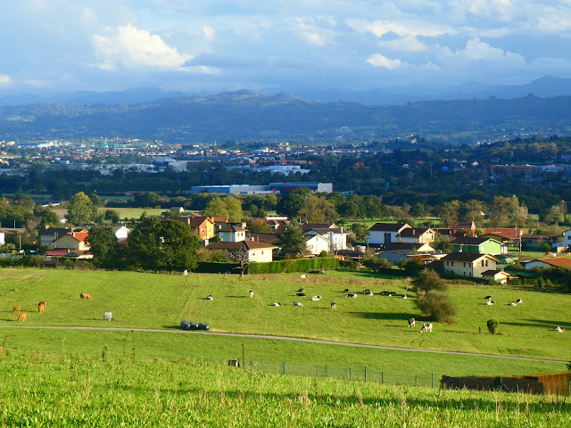 A su derecha, por Los Eros, La Vana y La Caleya hemos venido a Posada, cuyos edificios de la calle Carrión y Avendia de Oviedo vemos desde aquí, siguiendo Camino tras haber pasado a Llanera por La Ponte Cayés, puente sobre el Nora, procedentes de la parroquia ovetense de Villaperi, en la falda del Naranco, cuyas canteras vemos en la distancia